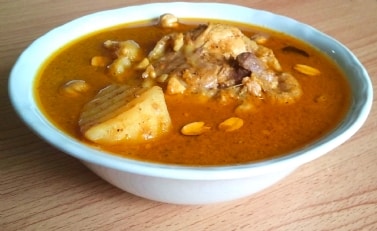 Mix 100 ml kokosmelk met 100 ml water and houd 200 ml kokosmelk apart in een kom. Doe wat rijstolie in een pan op medium warmte en wanneer dit heet is, doe the massaman currypasta erbij (meer/minder bepaalt de heetheid). Roerbak totdat het aroma vrijkomt, voeg de 200 ml kokosmelk toe en laat dit 5 minuten koken. Voeg toe de tamarinde, de cardamom, de laurierblaadjes en de gemalen kaneel. Wanneer dit heerlijk geurig is, zet de warmtebron laag. Doe wat rijstolie in een pan en wanneer dit heet is, braad de kipstukken aan gedurende 30 seconden. Kook de aardappelen in heet water, koel deze af in koud water en snijd in stukjes. Warm de massaman soep op en voeg dan de mix 200 ml kokosmelk en water toe en laat dit 5 minuten doorkoken. Doe er wat vissaus bij. Daarna de smaak balanceren met zoet door er palmsuiker aan toe te voegen. Voeg de aangebraden kipstukken toe totdat deze gaar zijn. Voeg de gekookte aardappelstukjes toe en de geroosterde pinda’s. Van de warmtebron afhalen.