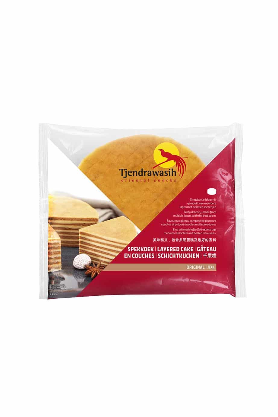 Tjendrawasih Spekkoek Original is een exotische snack; ideaal om uzelf en uw gasten eens te verwennen. Elke laag wordt met zorg bereid en bestaat uit de beste specerijen. Heerlijk als tussendoortje of als onderdeel van de lunch. Ook lekker als nagerecht bij de oosterse maaltijd.